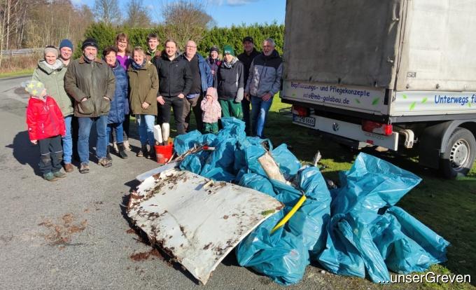 Die Aktiven des CleanUps in Aldrup mit den gesammelten Müllsäcken.
